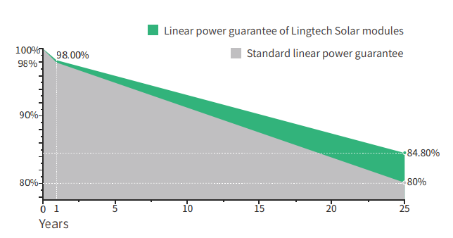 تدهور منخفض: التدهور في السنة الأولى أقل من 2.0%، مع تدهور خطي بنسبة 0.55% سنويًا لمدة 25 عامًا.