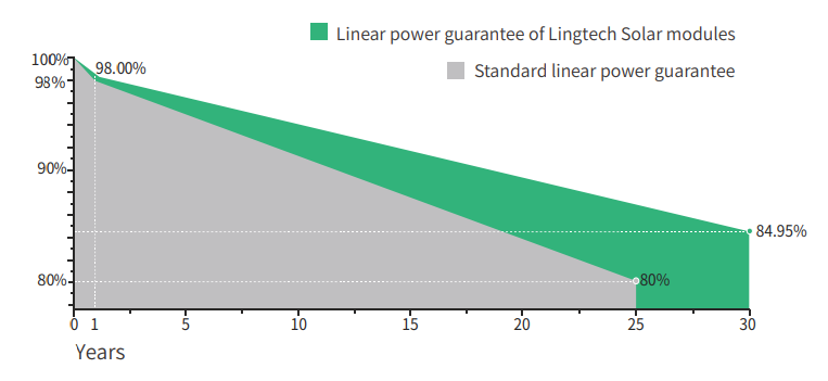 Low degradation: First-year degradation is less than 2.0%, with linear degradation of 0.45% per year for 30 years.